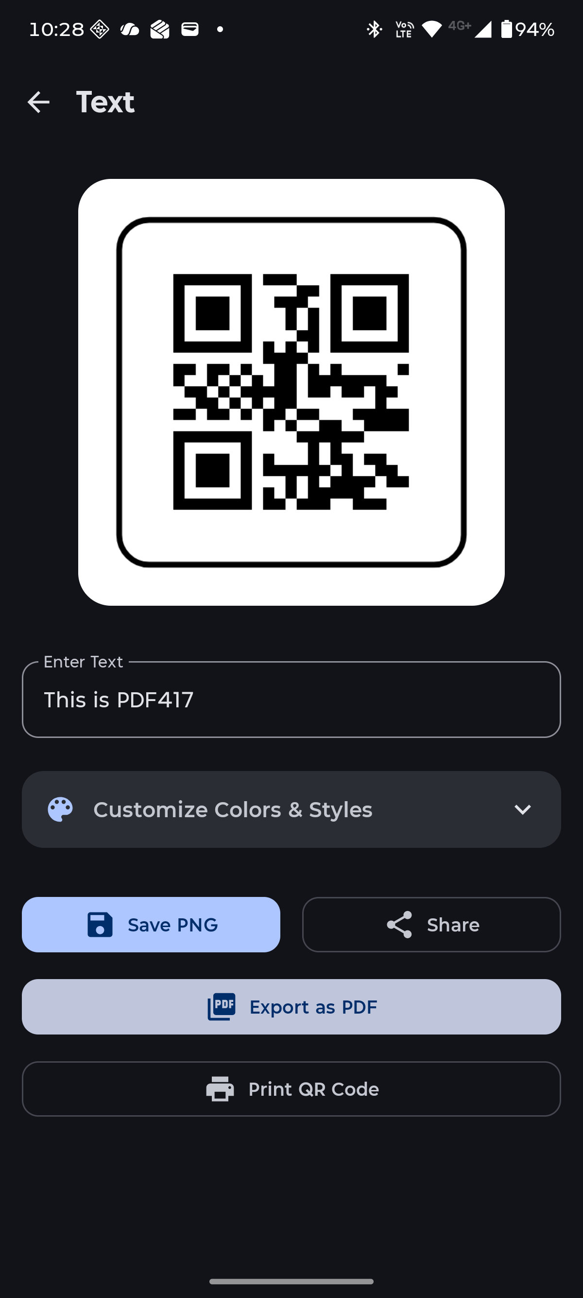 Export as PNG or PDF. Generate codes directly via the Android Share menu.