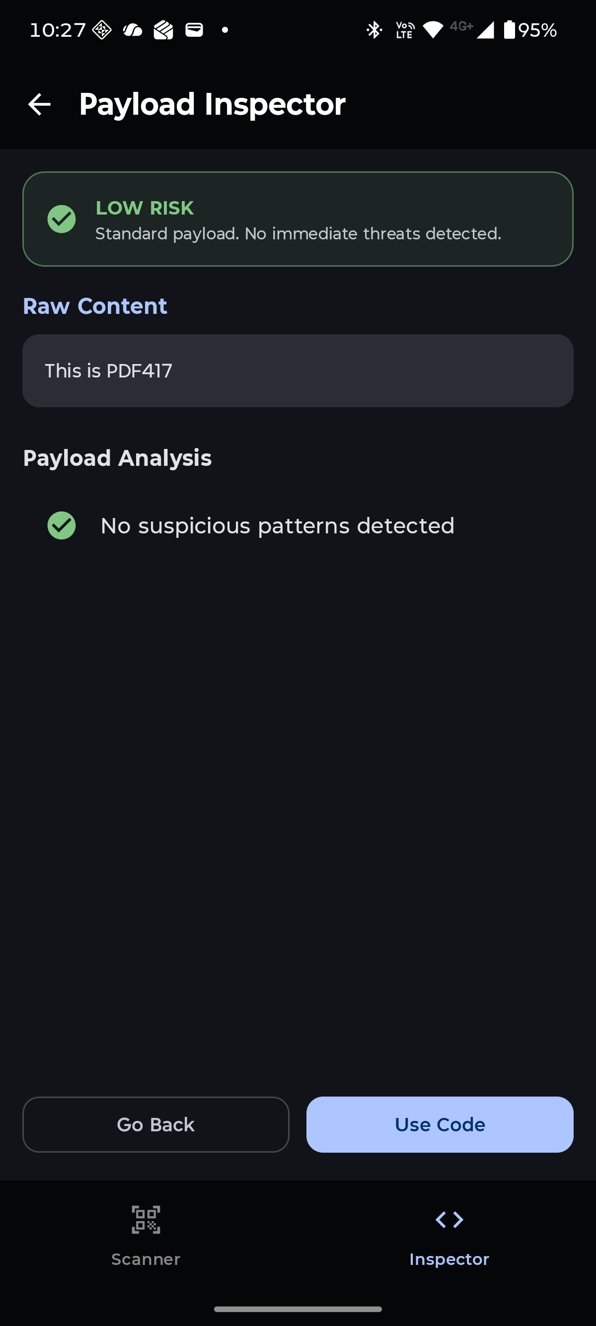 Auto-zoom and payload inspection for URLs, WiFi, and contacts with real-time feedback.